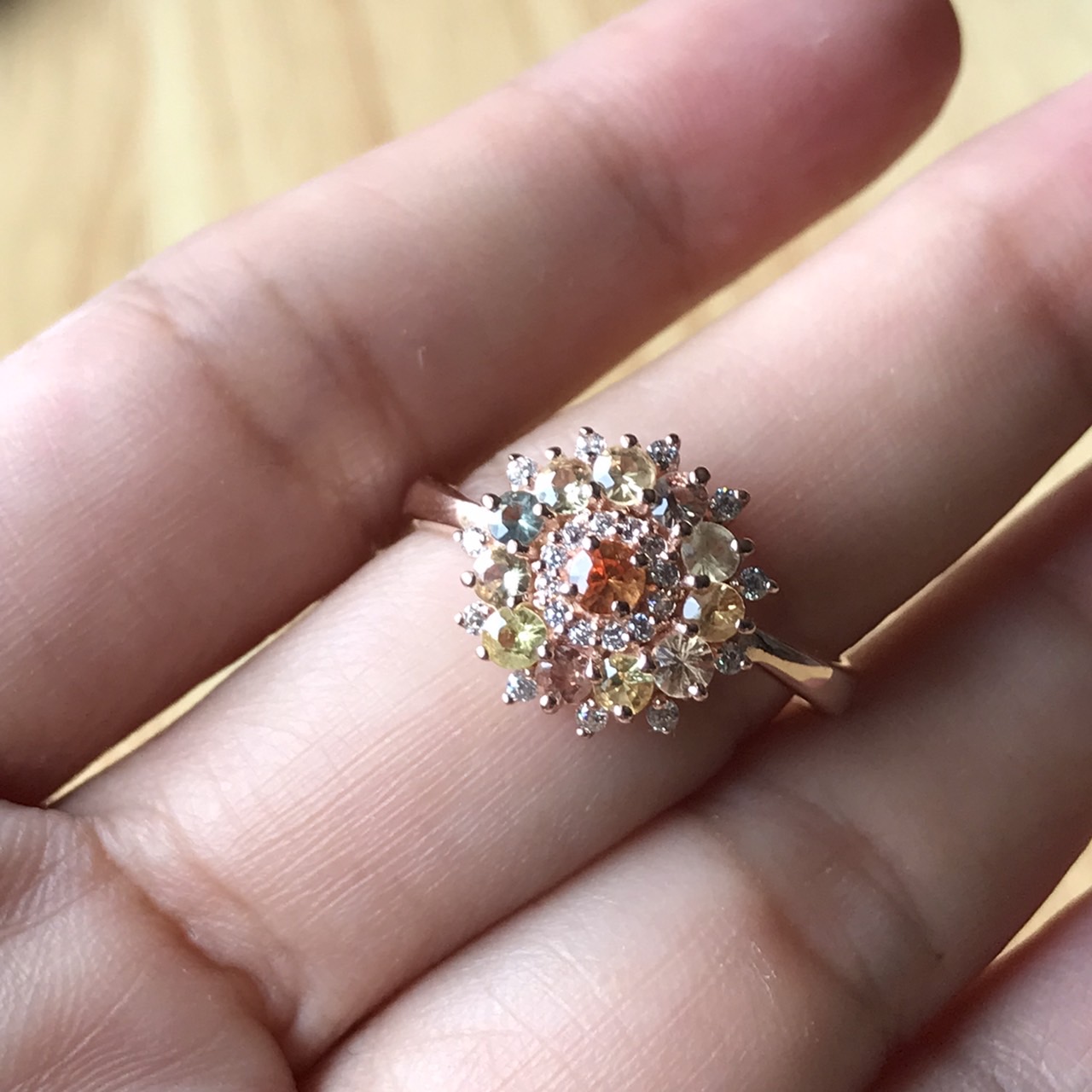 รายละเอียดสินค้า Metal :เงินแท้ 925 Stone : บุษราคัม ออเรนจ์แซฟไฟร์ เขียวส่อง 0.95กะรัต Stone : เพชร cz mix size Plated :ชุบทองพิงค์โกลด์ Measurement : ก้านแหวนกว้าง 4มิล หนา 1มิล Package : กล่องกำมะหยี สินค้ามีใบรับประกัน